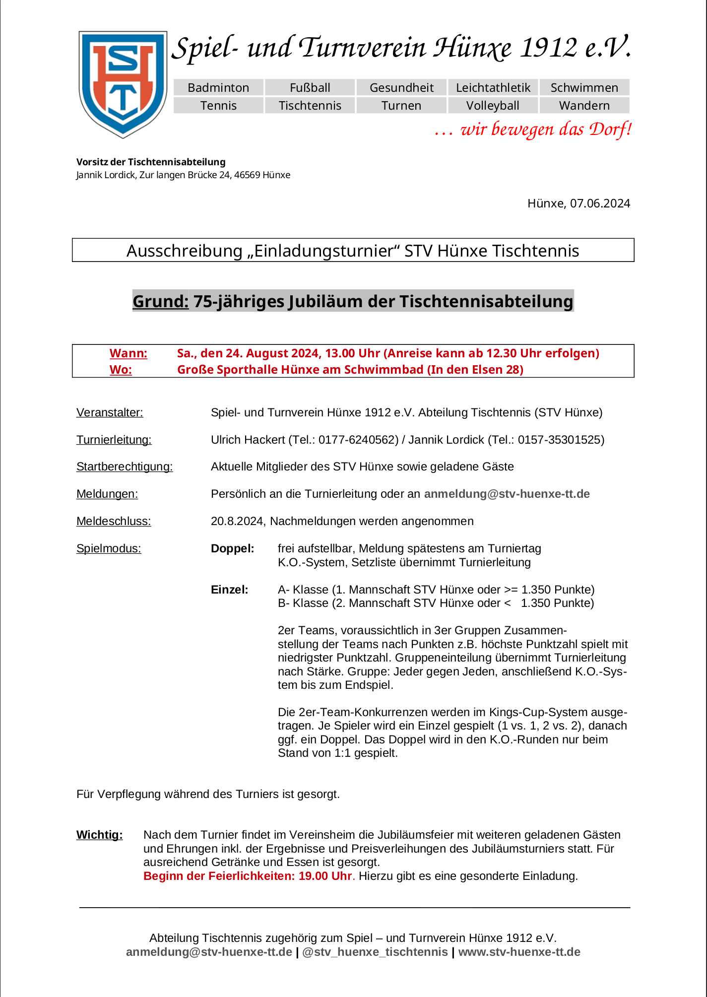 Die Jubiläumsfeier findet am Samstag, den 24. August 2024, um 19 Uhr im Vereinsheim des STV Hünxe statt.